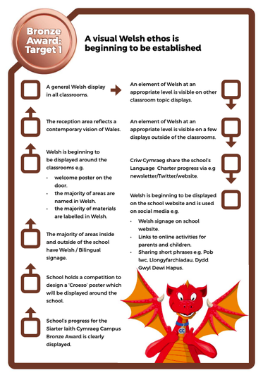 Welsh is prominently displayed on some signs and displays around the school. In August 2022, we had our signs around the school translated with the new school logo. In Summer 2023, the office area also had a redesign. During this, we translated our school motto and put Welsh welcome signs around.